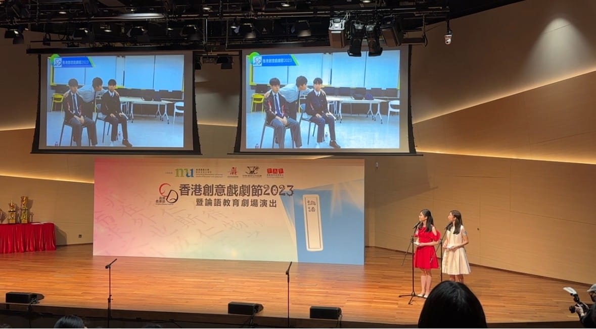 本校戲劇隊派出三位中五同學 —— 陳湕諾、江健峰、周展霆,參與了由香港都會大學教育及語文學院及香港教師戲劇會所舉辦的「創意戲劇節2023」,並榮獲優異獎,獲邀出席五月二十日之「創意戲劇節2023頒獎禮暨論語故事教育劇場演出」,在此恭賀三位同學。