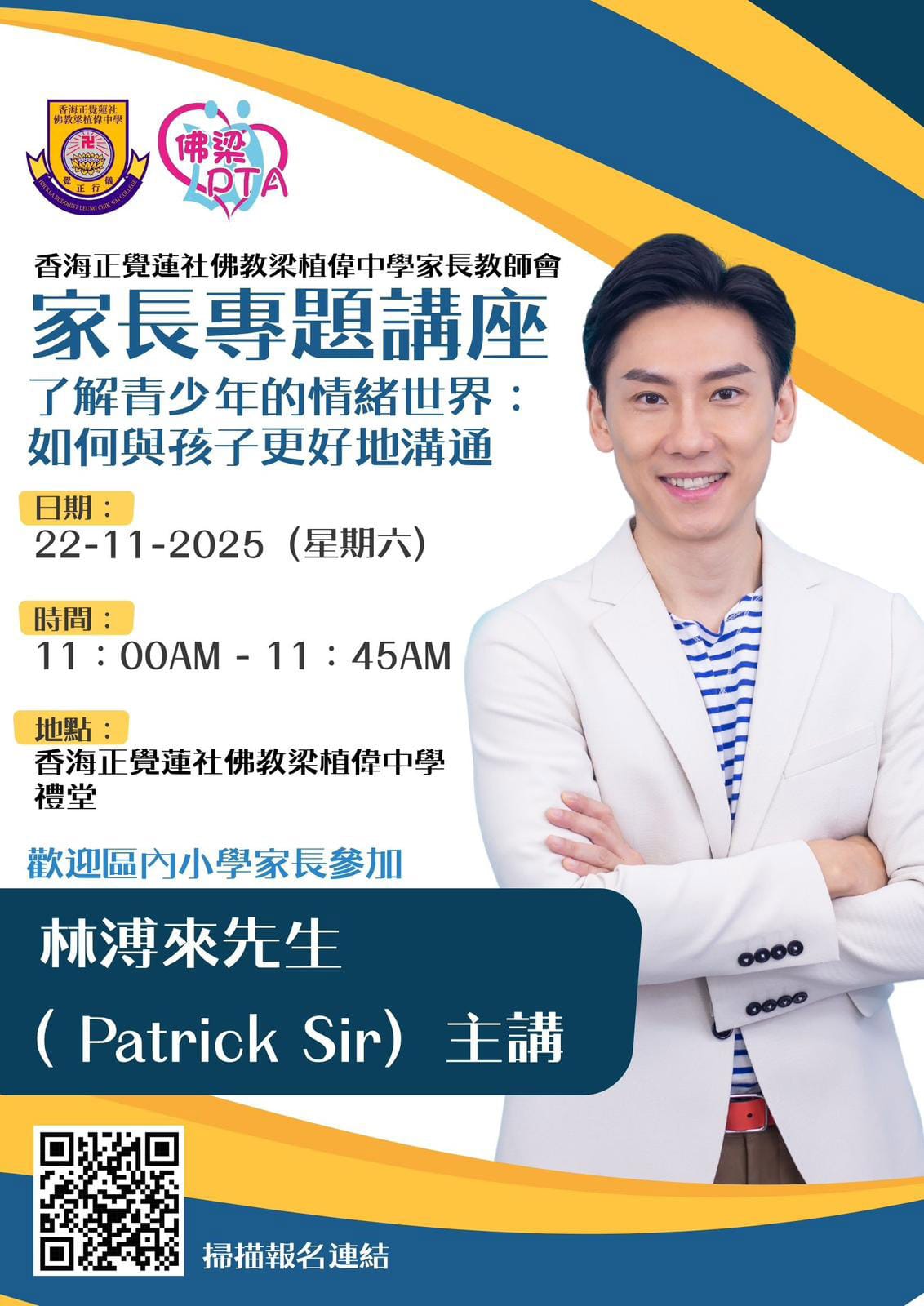 我們很高興邀請到著名節目主持及教育專家林溥來先生( Patrick Sir )擔任主講嘉賓。他將以「了解青少年的情緒世界:如何與孩子更好地溝通」為題,憑藉其豐富的經驗,為各位家長提供實用的建議與方法。